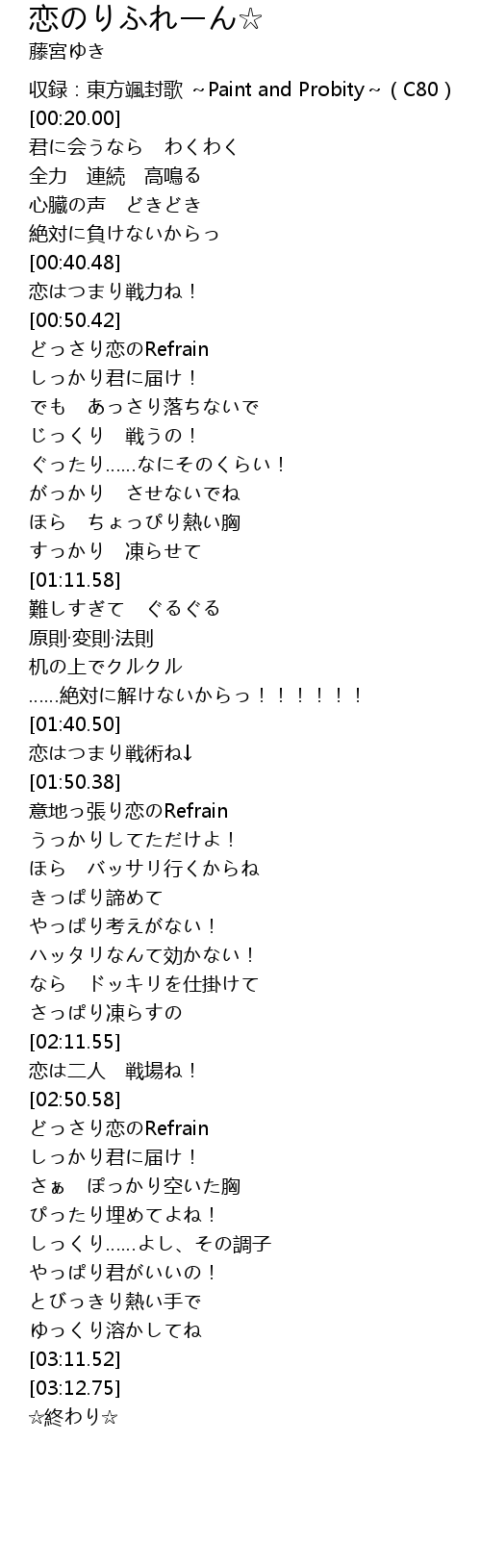 | [00:16.00] | 収録:東方颯封歌 ~Paint and Probity~(C80) |