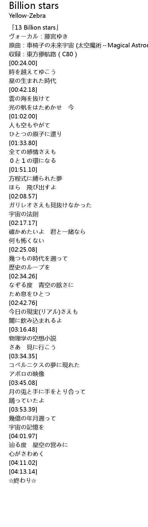 | [00:14.00] | 原曲:車椅子の未来宇宙 (太空魔術~Magical Astronomy) |