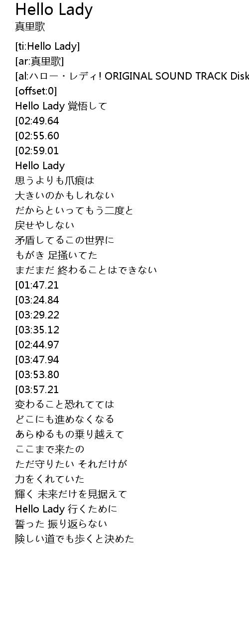 | [01:07.36][03:24.84] | Hello Lady 行くことを |
