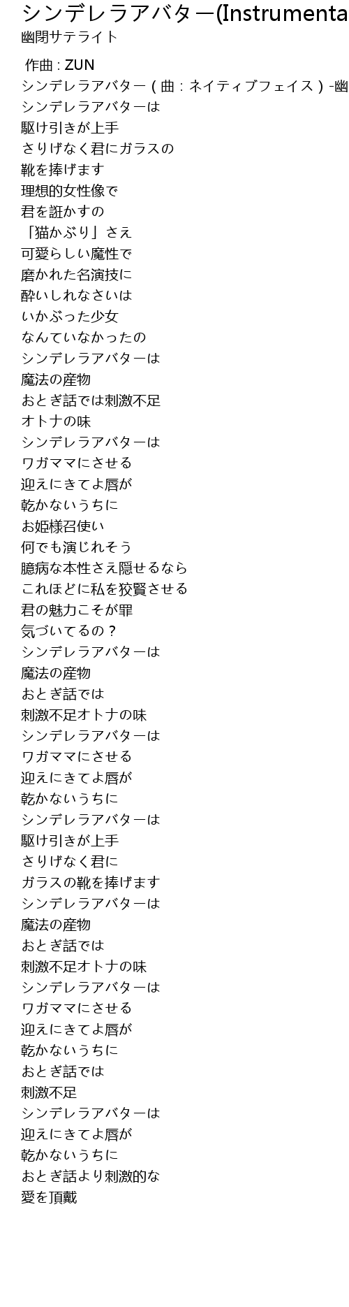 | [00:00.00] | シンデレラアバター(曲:ネイティブフェイス)-幽閉サテライト |