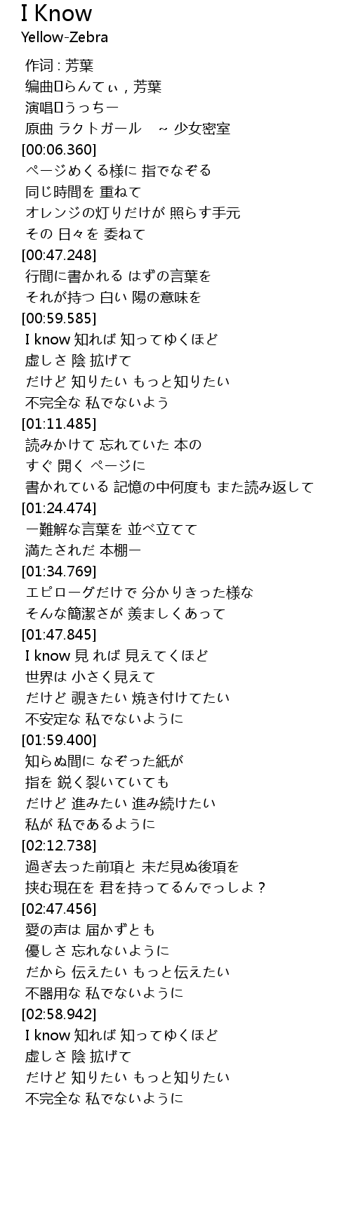 | [02:58.943] | I know 知れば 知ってゆくほど |