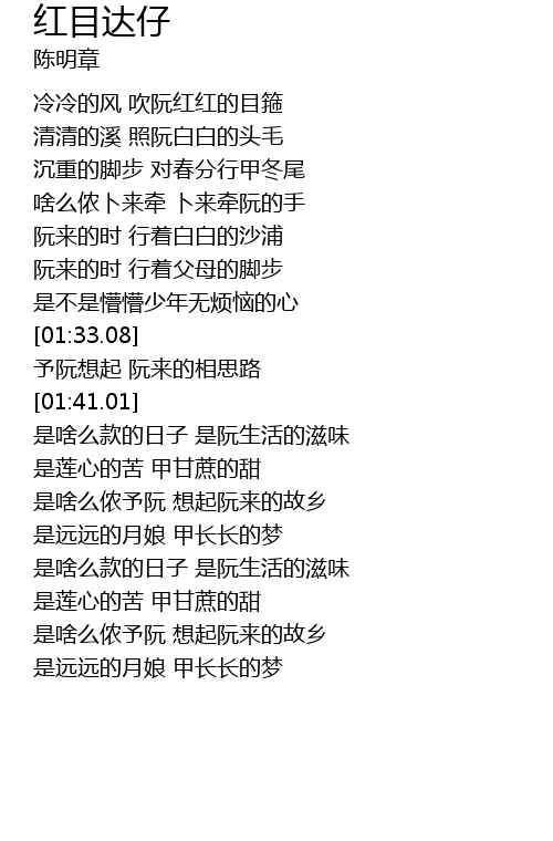 | [02:59.47] | 是啥么侬予阮 想起阮来的故乡 |