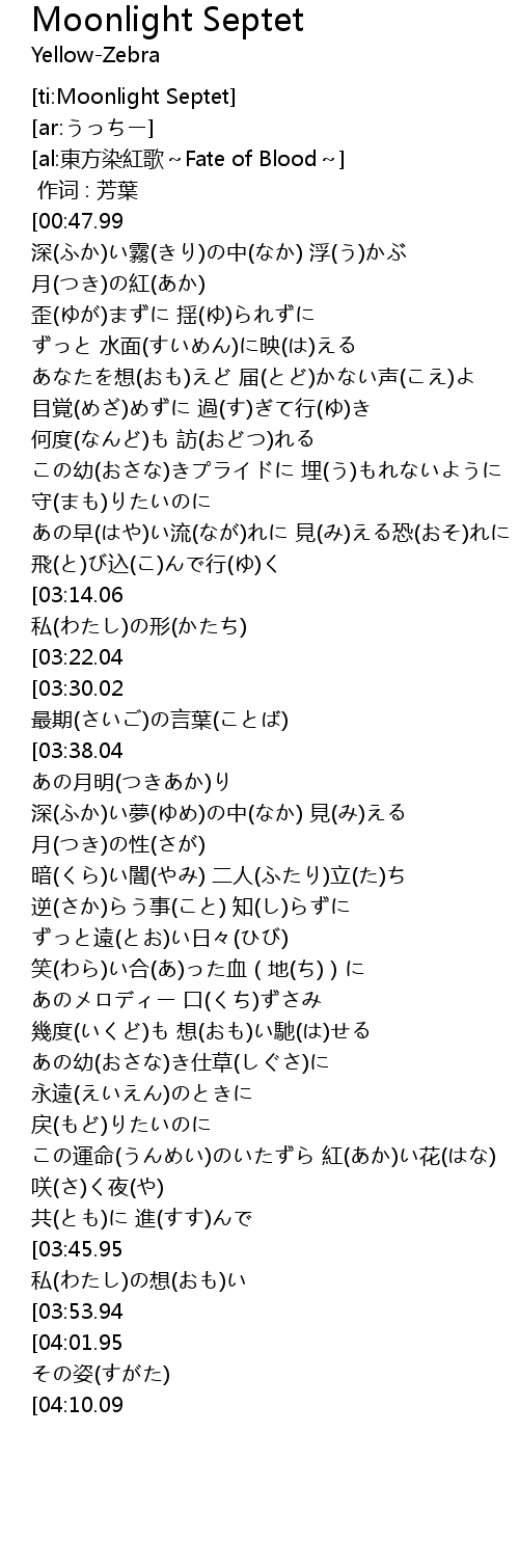 | [01:53.26] | 深(ふか)い夢(ゆめ)の中(なか) 見(み)える 月(つき)の性(さが) |