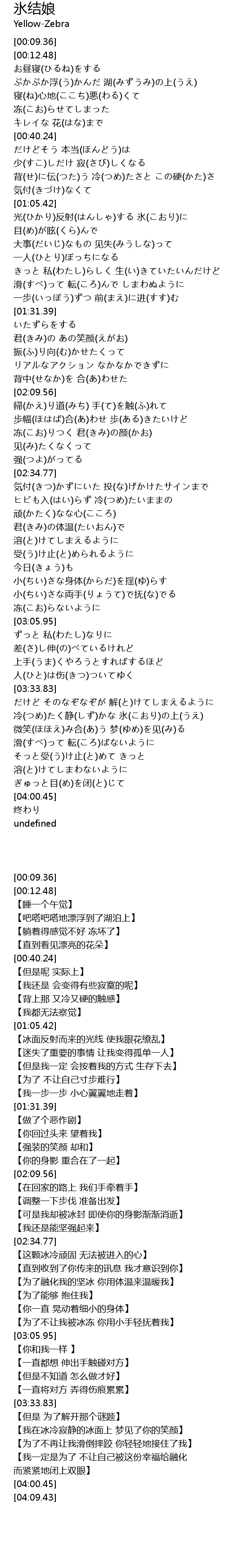 | [03:40.26] | 冷(つめ)たく静(しず)かな 氷(こおり)の上(うえ) 微笑(ほほえ)み合(あ)う 梦(ゆめ)を见(み)る |