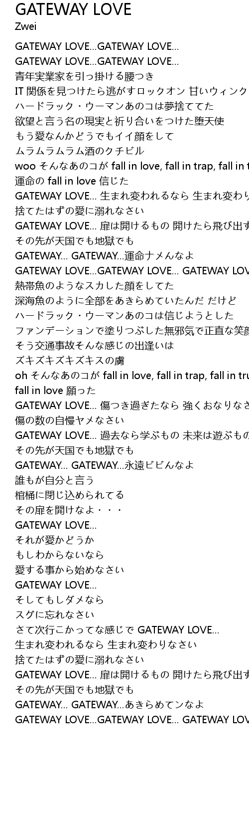 | GATEWAY LOVE... 傷つき過ぎたなら 強くおなりなさい 傷の数の自慢ヤメなさい | |