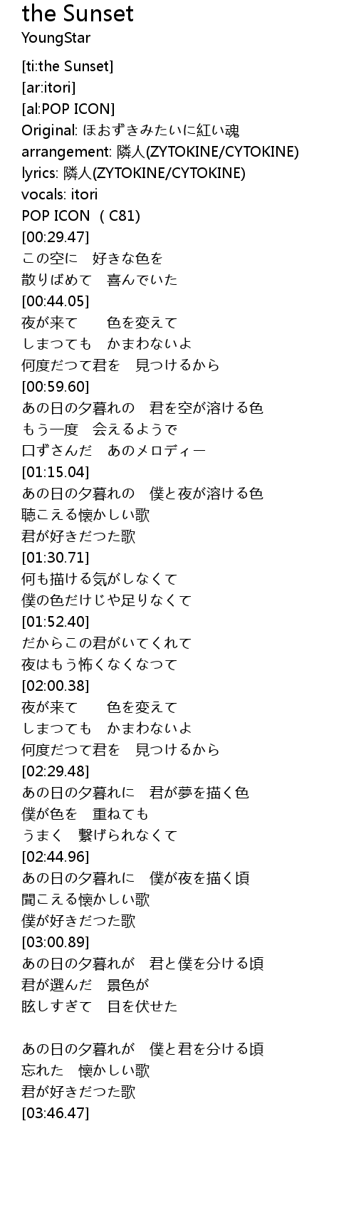 | [03:30.35] | あの日の夕暮れが 僕と君を分ける頃 |