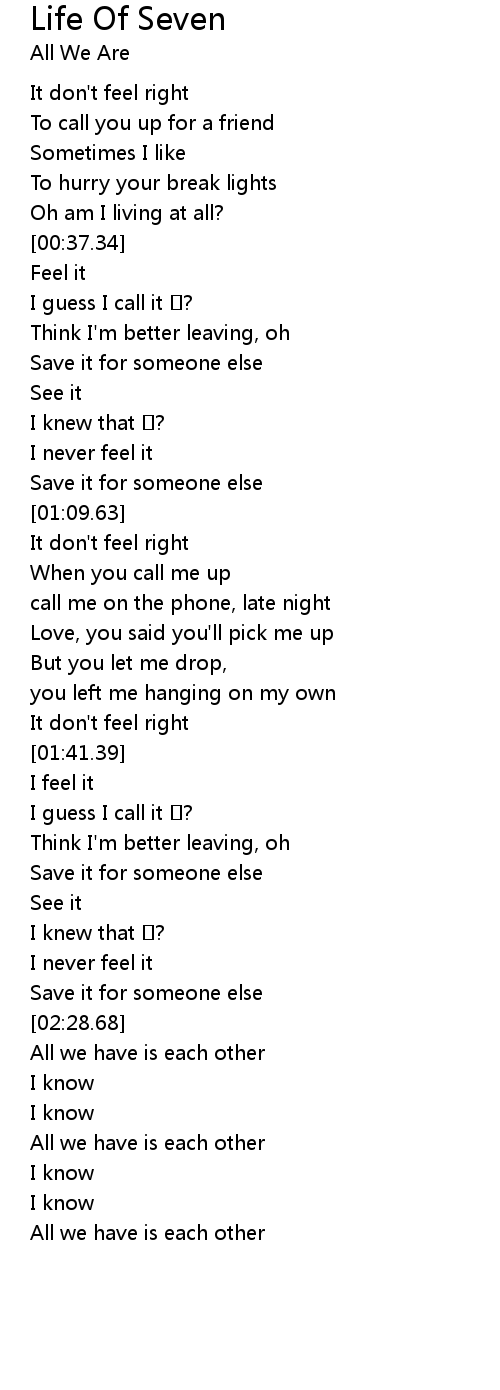 | [00:07.87] | It don' t feel right |