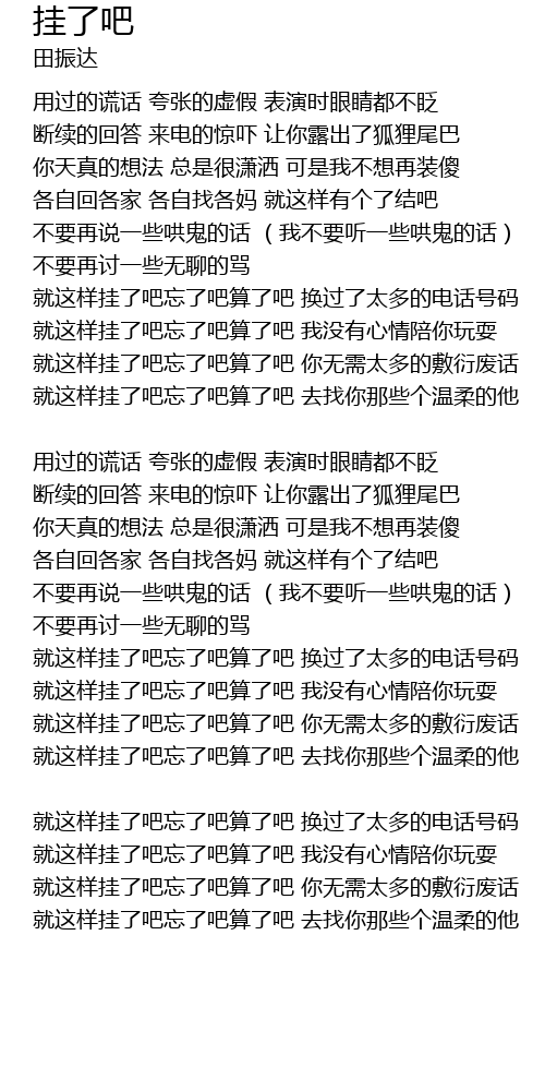 | 就这样挂了吧忘了吧算了吧 你无需太多的敷衍废话 | |