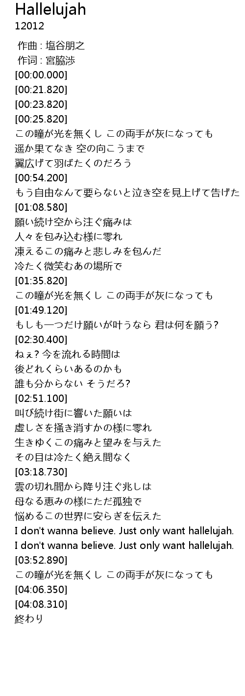 | [03:46.050] | I don't wanna believe. Just only want hallelujah. |