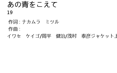 | [00:00.000] | 作曲 : イワセ ケイゴ/岡平 健治/茂村 泰彦ジャケット上、作曲は「イワセ ケイゴ」のみ表記 |