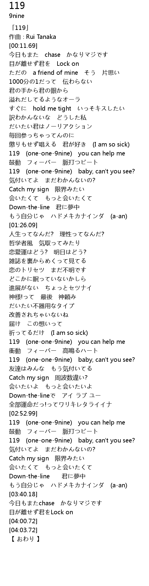 | [03:16.57] | 119 (one-one-9nine) baby, can't you see? |