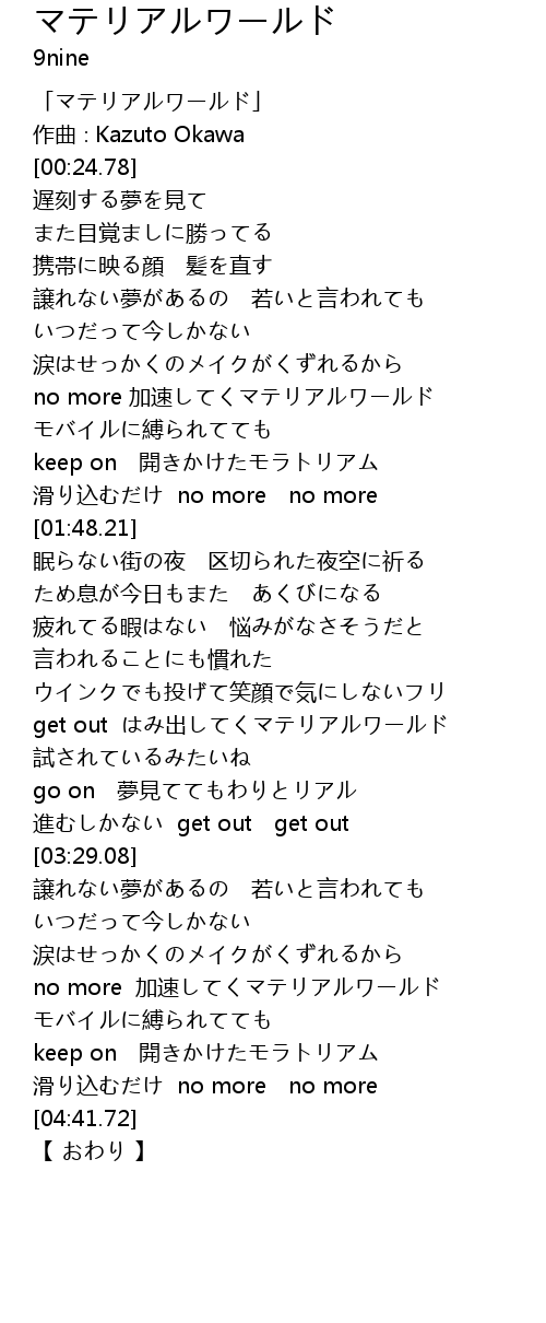 | [01:12.61] | no more 加速してくマテリアルワールド |