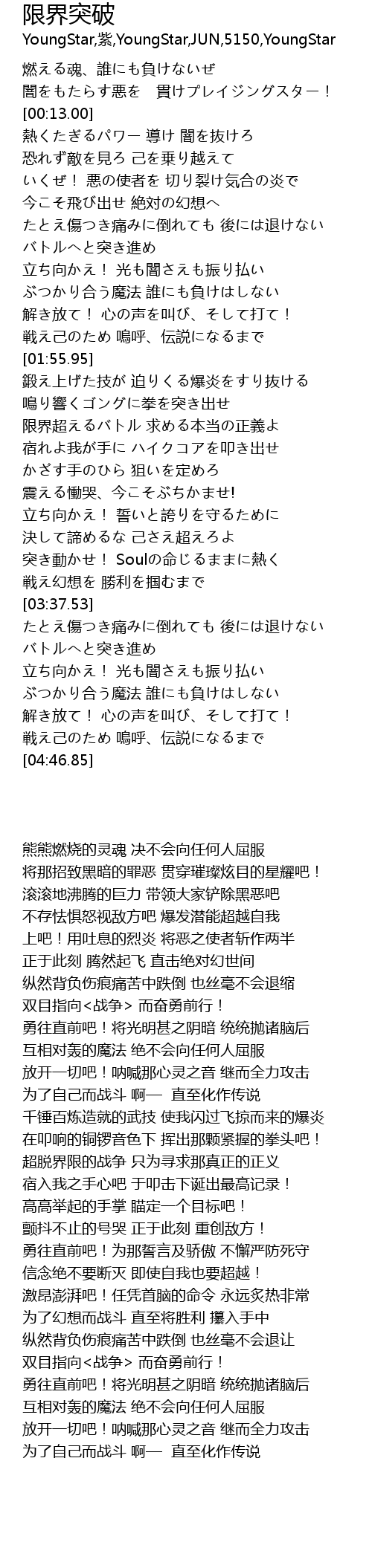 | [03:24.75] | tū dòng! Soul mìng rè |
