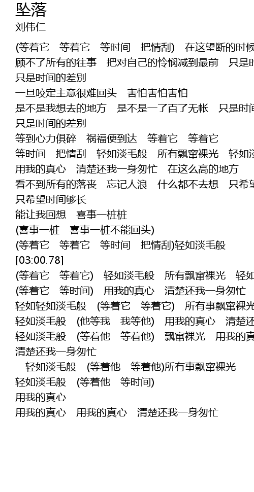 | [03:30.12] | 轻如淡毛般 (他等我 我等他) 用我的真心 清楚还我一身匆忙 |