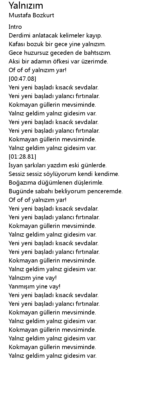 | [01:23.88] | Yalnız geldim yalnız gidesim var. |