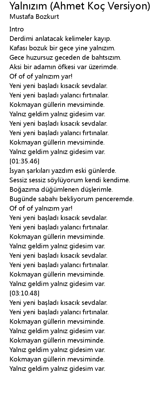 | [01:30.45] | Yalnız geldim yalnız gidesim var. |