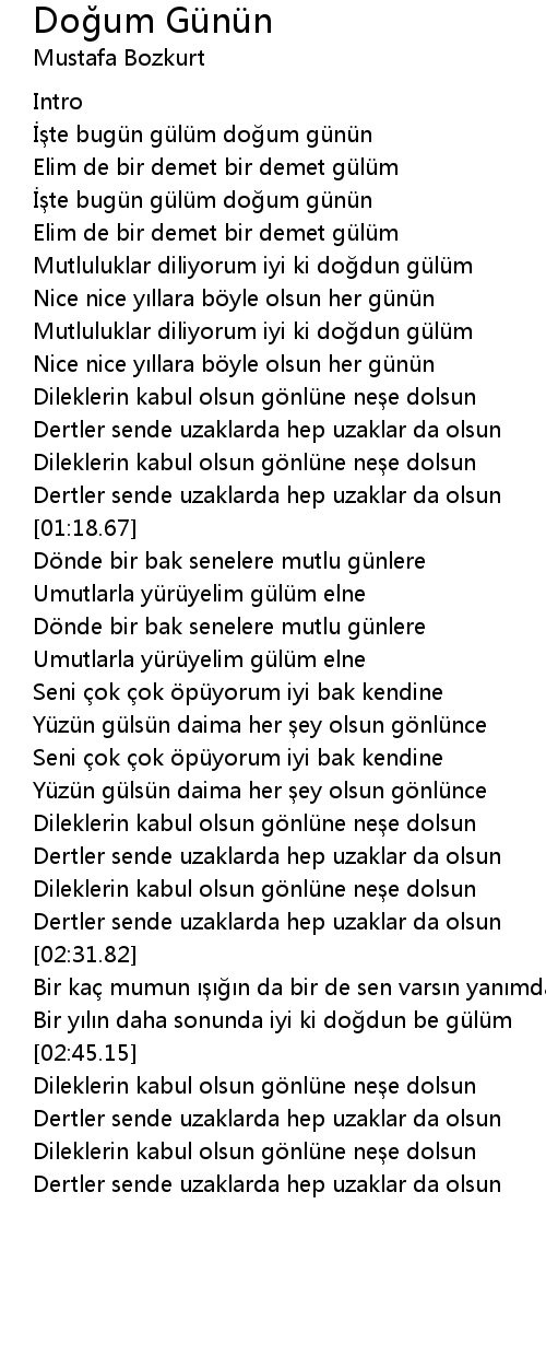 | [02:39.52] | Bir y l n daha sonunda iyi ki do dun be gü lü m |