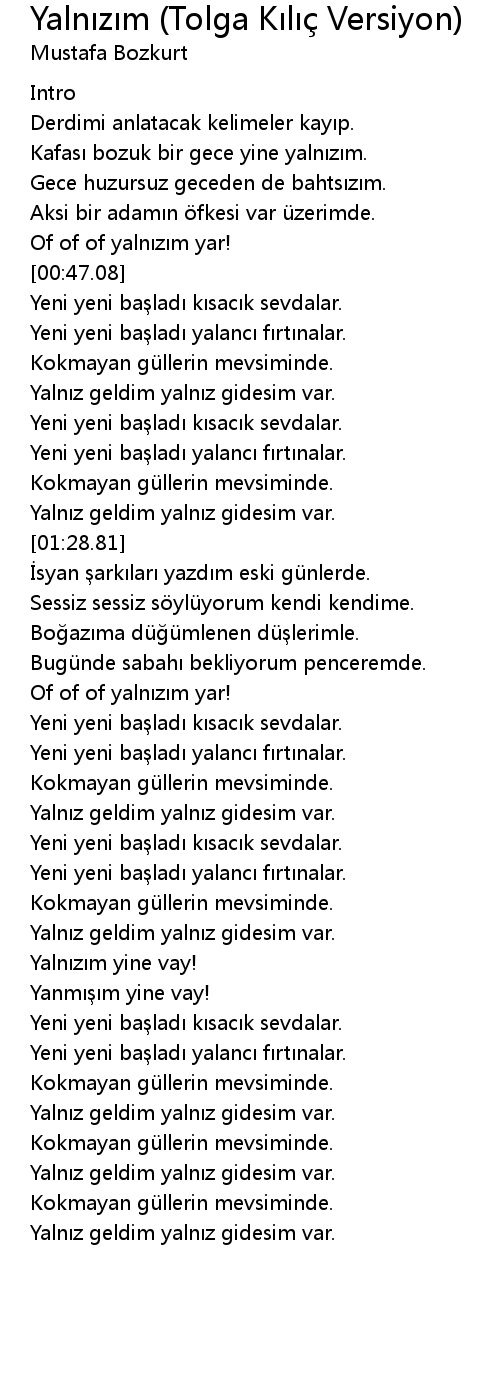 | [01:23.88] | Yalnız geldim yalnız gidesim var. |