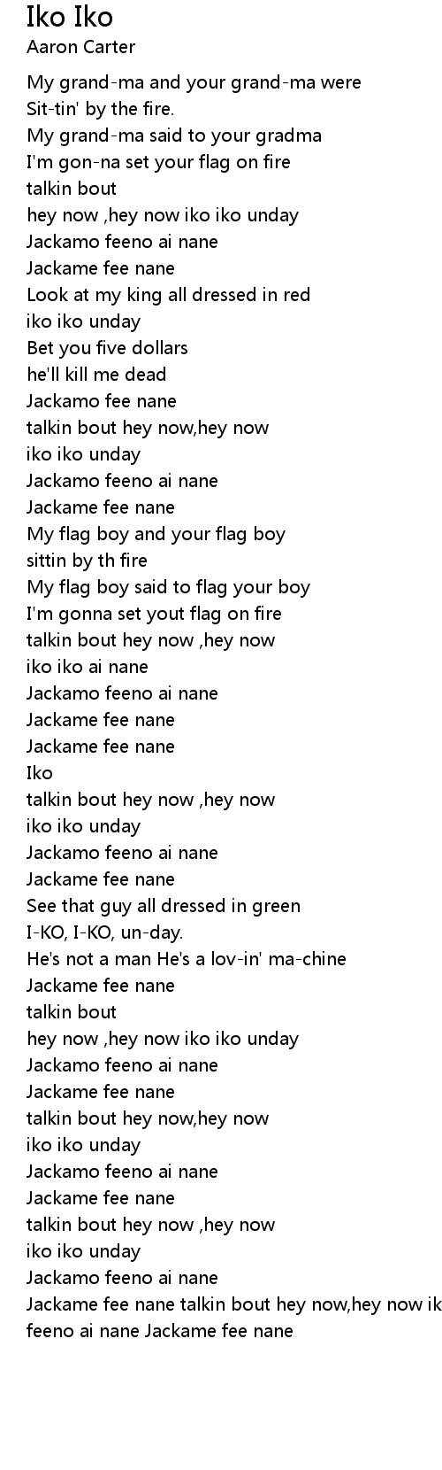 [02:27.900] Jackame fee nane talkin bout hey now,hey now iko iko unday Jackamo feeno ai nane Jackame fee nane