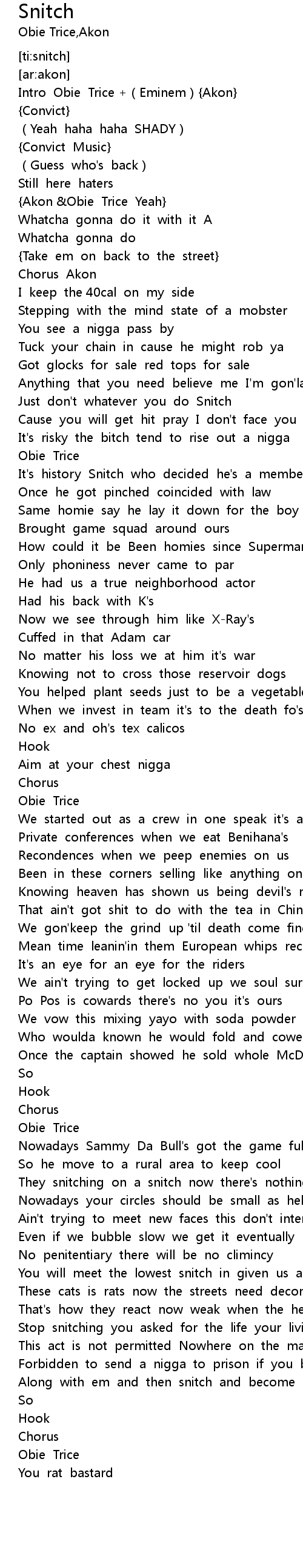 | [00:39.563] | Just don' t whatever you do Snitch |