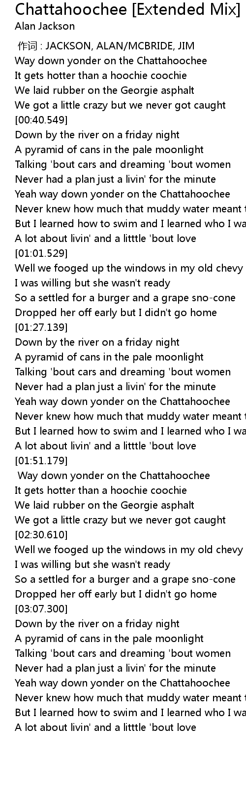 | [00:51.79] | Yeah way down yonder on the Chattahoochee |