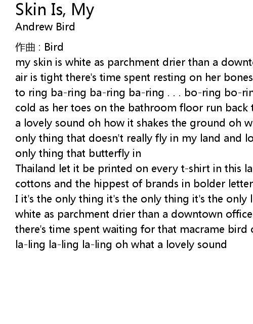 | my skin is white as parchment drier than a downtown office building where the air is tight there's time spent resting on her bones waiting for the telephone to ring ba-ring ba-ring ba-ring . . . bo-ring bo-ring bo-ring . . . my skin is cold as her toes on the bathroom floor run back to bed and slam the door oh what a lovely sound oh how it shakes the ground oh what a lovely skin is my it's the only thing that doesn't really fly in my land and love is my love is it's the only thing that butterfly in | |
