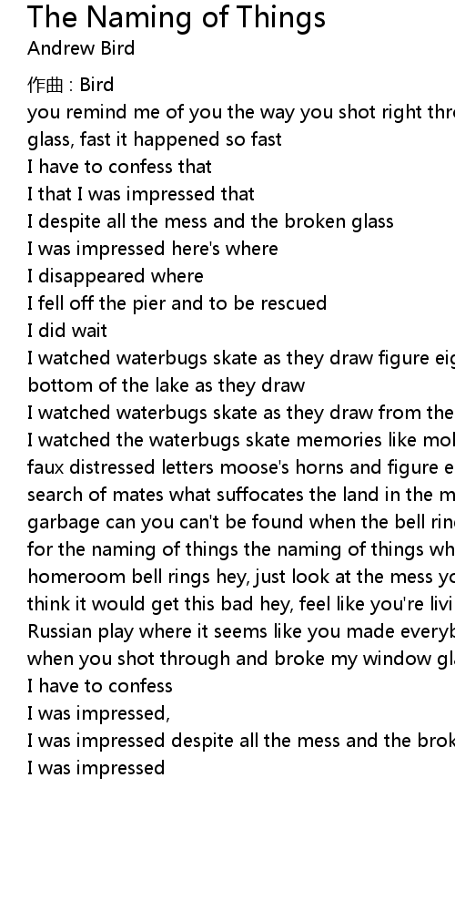 | I watched the waterbugs skate memories like mohair sweaters stretched and pilled faux distressed letters moose' s horns and figure eights white plastic bags in search of mates what suffocates the land in the memory of garbage can memory of garbage can you can' t be found when the bell rings you weren' t there that day for the naming of things the naming of things where the homeroom bell rings the homeroom bell rings hey, just look at the mess you made today didn' t really think it would get this bad hey, feel like you' re living in a | |
