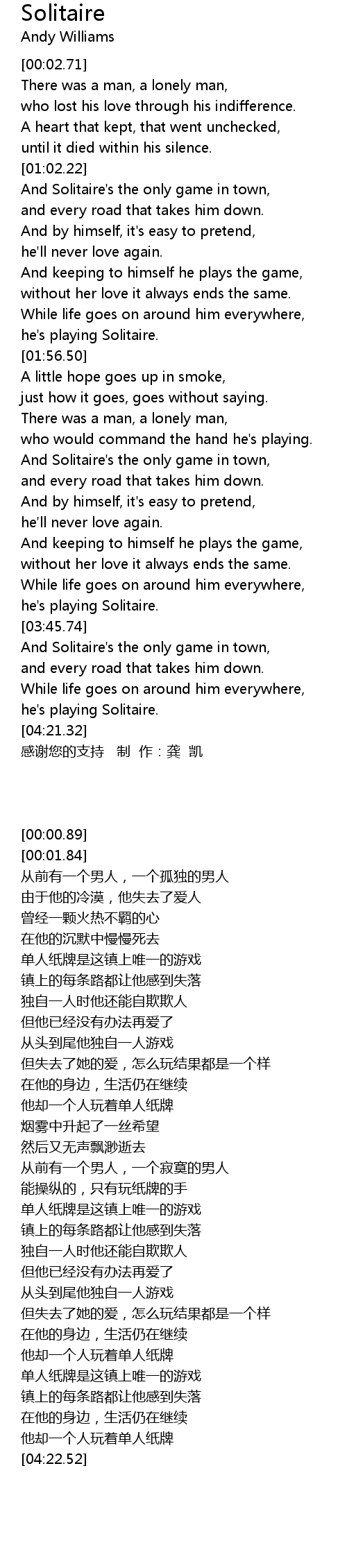 | [01:03.62] | And Solitaire' s the only game in town, |