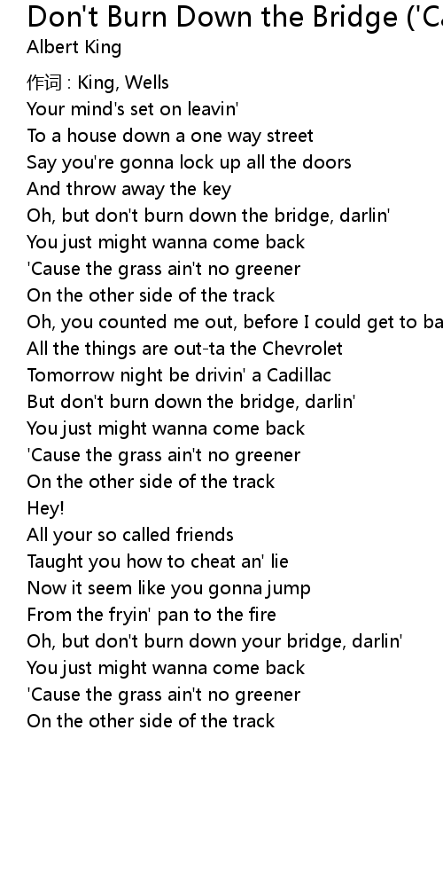 | Song | Don't Burn Down the Bridge ('Cause You Might Wanna Come Back Across) |