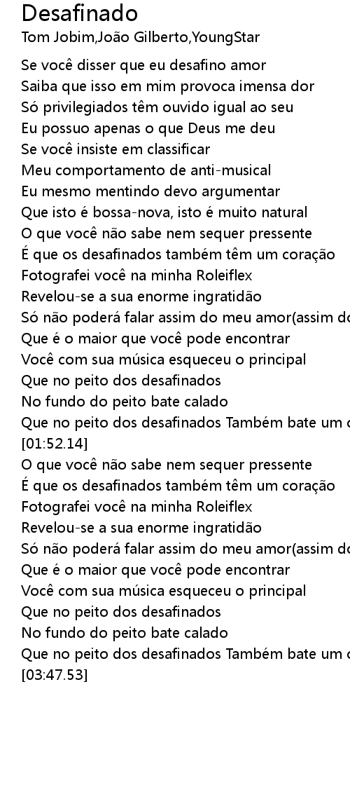 | [01:47.14] | Que no peito dos desafinados Também bate um coração |