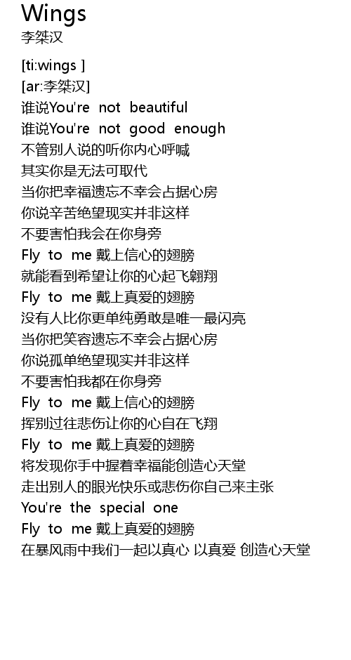 | [02:19.83] | Fly to me 戴上信心的翅膀 |
