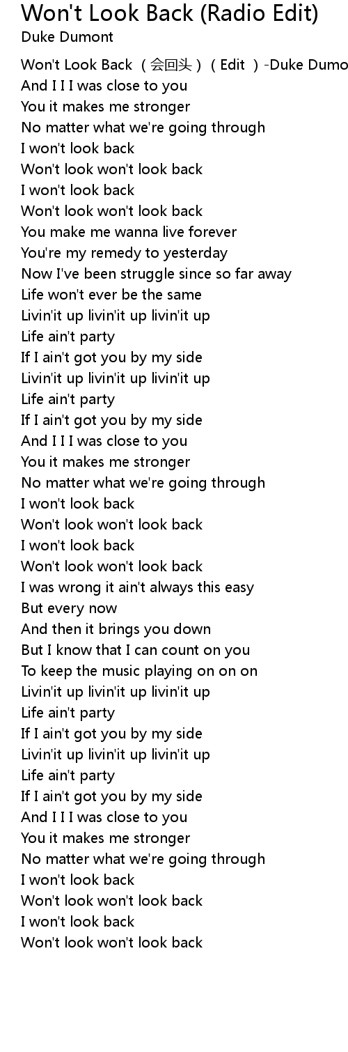 | [00:00.00] | Won' t Look Back huì huí tóu Edit Duke Dumont |