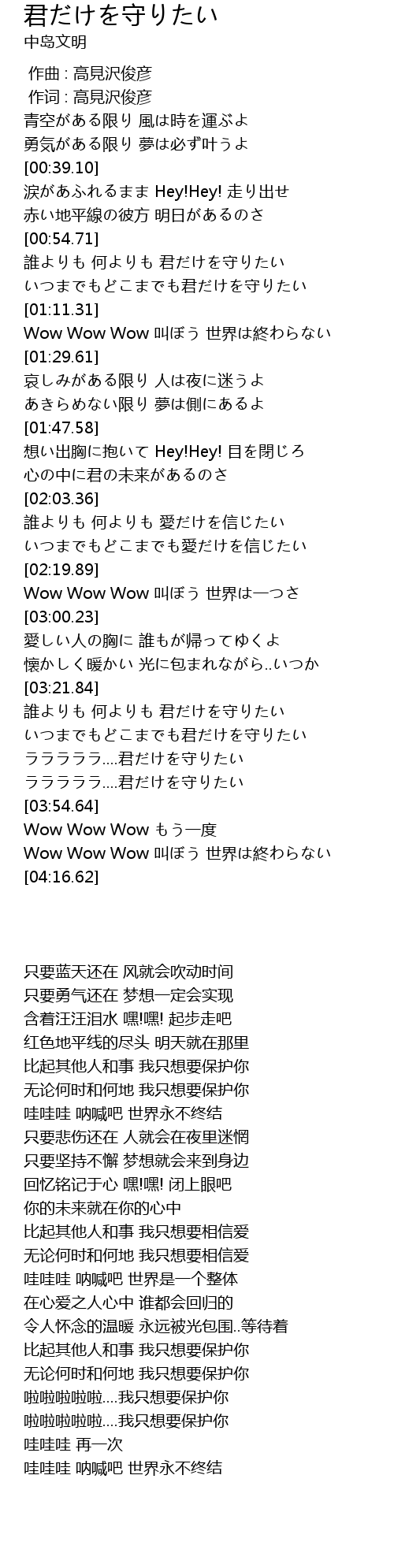 | [00:54.72] | 誰よりも 何よりも 君だけを守りたい |