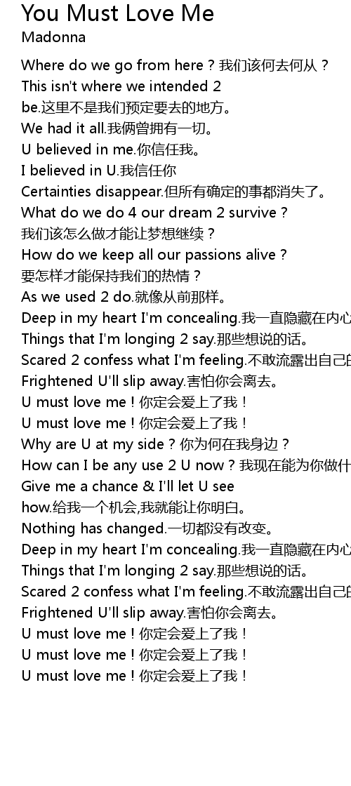 | [02:28.780] | U must love me ! ni ding hui ai shang le wo! |
