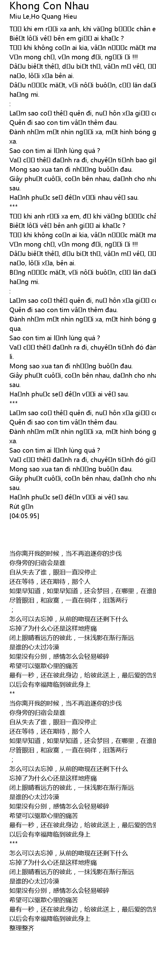 | [02:55.70] | Giây phút cuối, còn bên nhau, dành cho nhau, lời yêu sau. |