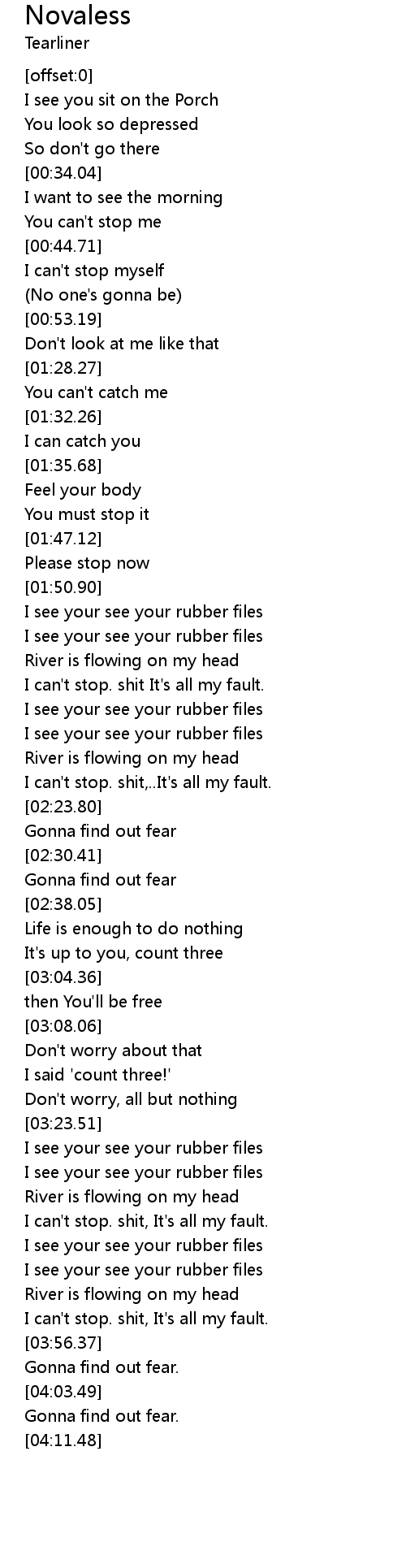 | [02:04.46] | I can't stop. shit It's all my fault. |