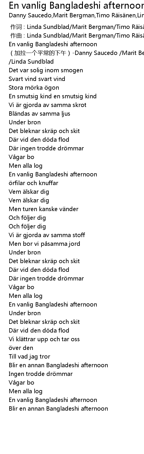 | [00:00.00] | En vanlig Bangladeshi afternoon jiā lā yí gè píng cháng de xià wǔ Danny Saucedo Marit Bergman Timo R is nen Linda Sundblad |