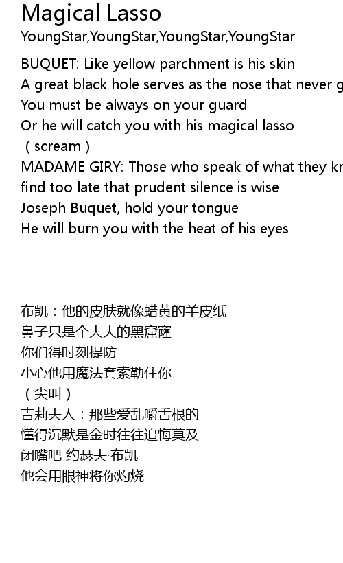 | [00:12.000] | BUQUET: Like yellow parchment is his skin |