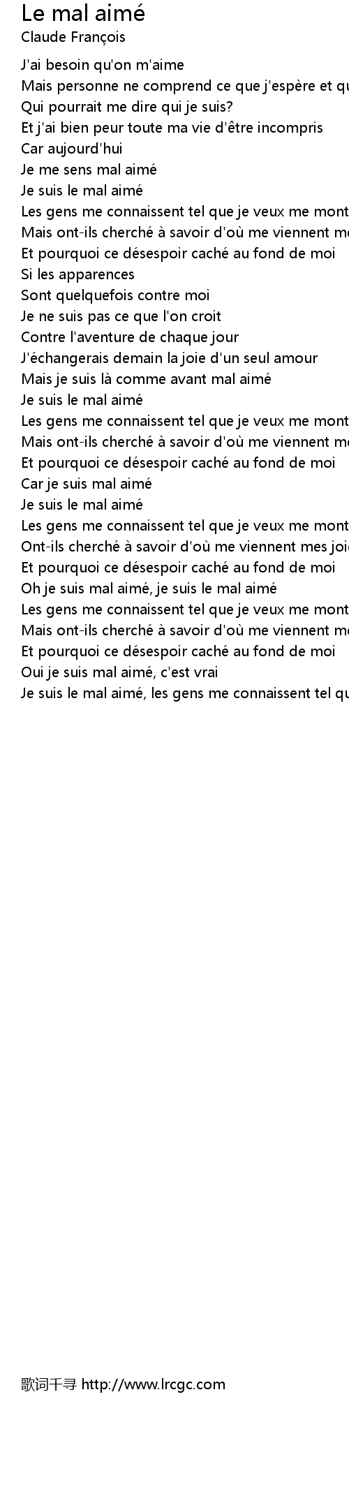 | [02:20.14] | Oui je suis mal aime, c' est vrai |