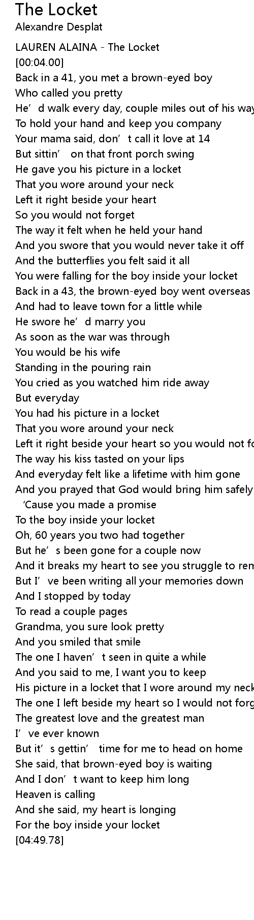 | [03:57.07] | His picture in a locket that I wore around my neck |