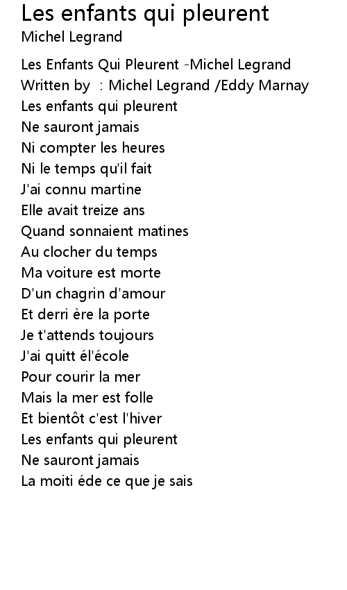 | [00:00.00] | Les Enfants Qui Pleurent Michel Legrand |