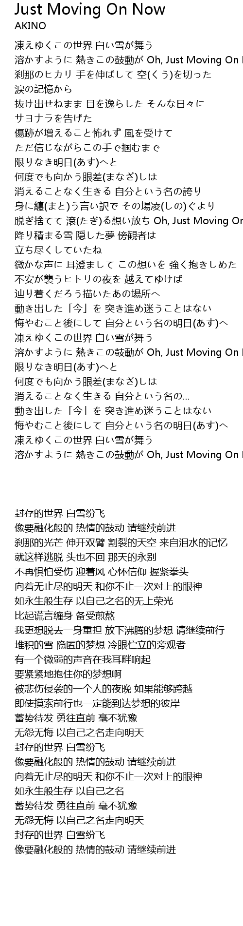 | [00:05.840] | 溶かすように 熱きこの鼓動が Oh, Just Moving On Now |