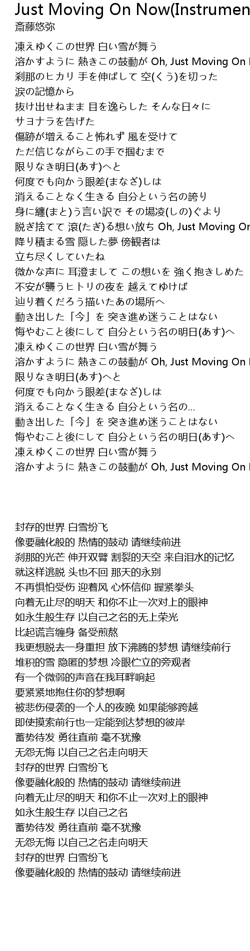 | [00:05.840] | 溶かすように 熱きこの鼓動が Oh, Just Moving On Now |