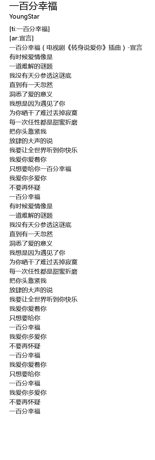 | [00:03.642] | 一百分幸福(电视剧《转身说爱你》插曲)-宣言 |