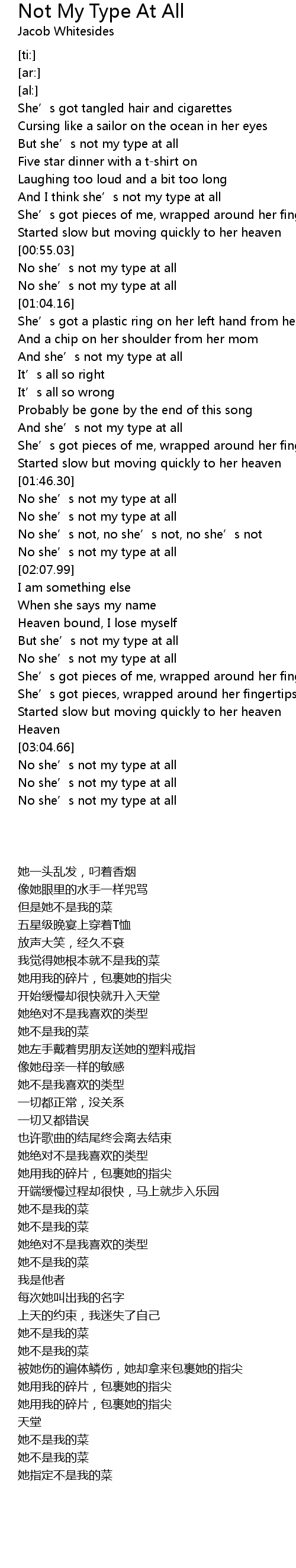| [03:06.81] | No she' s not my type at all |
