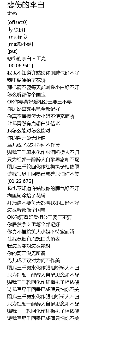 | [00:00.672] | 悲伤的李白 - 于亮 |