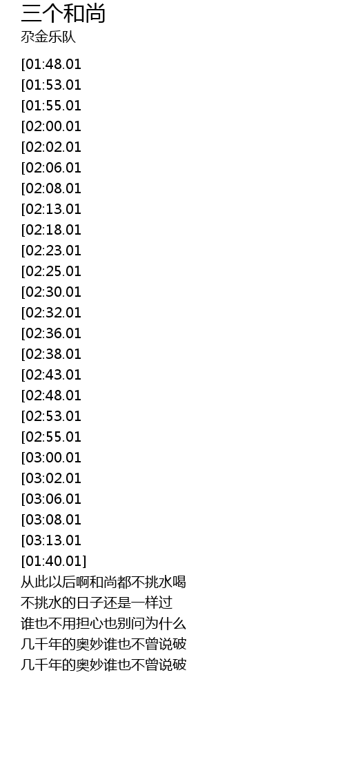 | [00:24.01][02:02.01] | sān ge hé shàng méi shuǐ hē ya méi ya méi shuǐ hē ya |