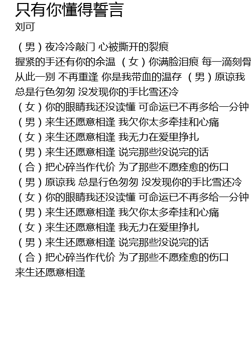 | [00:36.72] | (男)夜冷冷敲门 心被撕开的裂痕 握紧的手还有你的余温 (女)你满脸泪痕 每一滴刻骨铭心 |