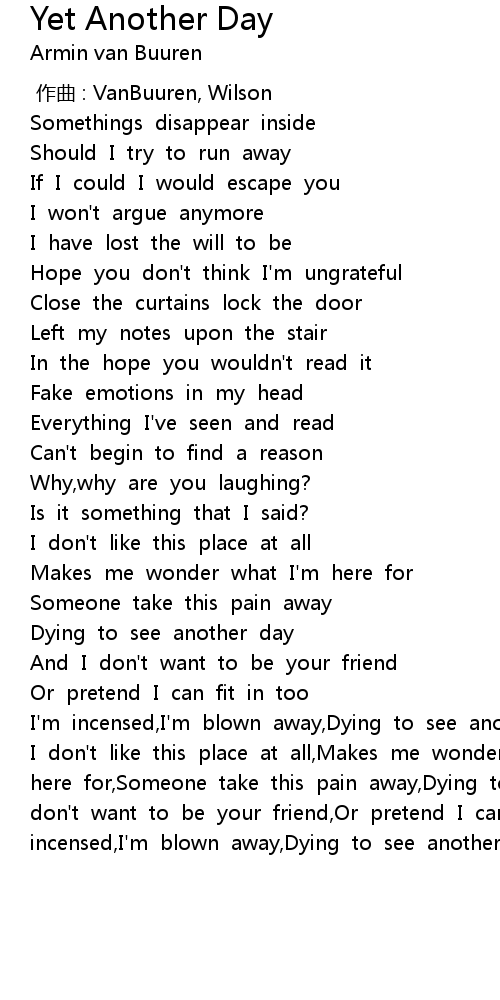 | [05:23.695] | I don' t like this place at all, Makes me wonder what I' m here for, Someone take this pain away, Dying to see another day, And I don' t want to be your friend, Or pretend I can fit in too, I' m incensed, I' m blown away, Dying to see another day |