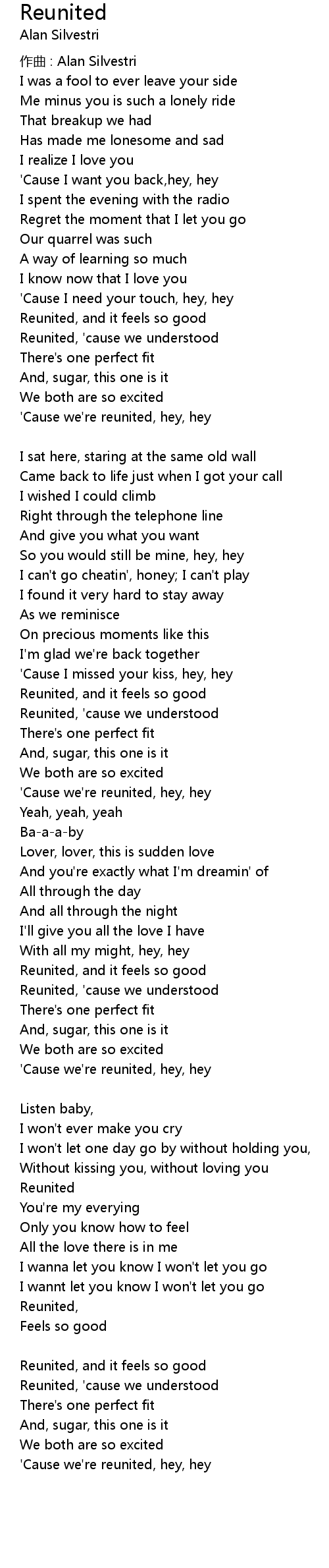 | ' Cause we' re reunited, hey, hey |